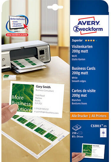 Az Avery Zweckform fehér, 85x54 mm formátumú szuperior névjegykártyái kiváló nyomtatási minőséget garantálnak minden szabványos nyomtatón. 250 névjegykártya 25 íven. Az egyik oldalán nyomtatható 200 g/m2 névjegykártya teljesen sima élekkel rendelkezik a QUICK&CLEAN technológiának köszönhetően. Környezetbarát, FSC® minősített és Klórmentes eljárással fehérí