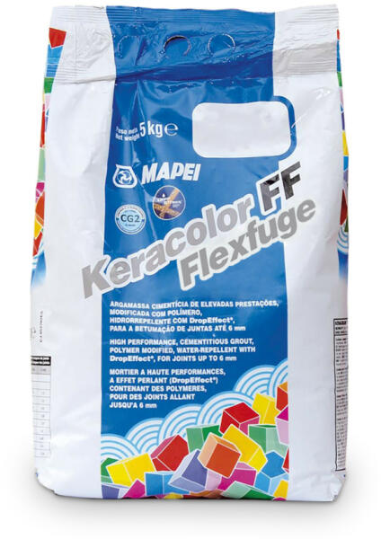 Mapei Keracolor FF Flex fuga beltérre, kültérre, aljzatra, padlófűtésre, természetes kő, és üvegmozaikhoz. Fokozott terhelhetőségű, polimerekkel módosított, DropEffect® technológiával készült vízlepergető tulajdonságú, cementkötésű fugázóhabarcs 6 mm fug