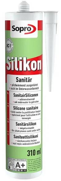 Sopro Szaniter Fugaszilikon 310 ml Felhasználásra kész, acetát bázisú szilikon fugázóanyag kiváló penészedésgátló hatással kapcsolódó és dilatációs fugák rugalmas kitöltésére szaniterek körüli területeken, például a csempeburkolat és a kád, zuhanytálca,