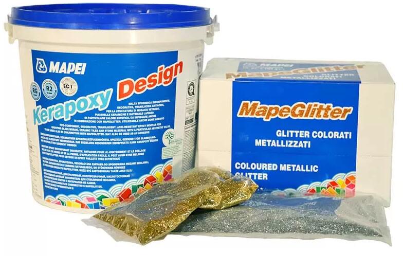 A Kerapoxy Design-hoz adott, MapeGlitter fényesen csillogó, metálfényű fugázóanyagot eredményez, alkalmas üvegmozaikok és üveglapok fugázásához. Alkalmazási területek: A Kerapoxy Design-hoz adott, a súlyra számított legfeljebb 10% MapeGlitter fényesen csillogó, metálfényű fugázóanyagot eredményez, amelyik különösen alkalmas fémlapok valamint üvegmozaikok és üvegla