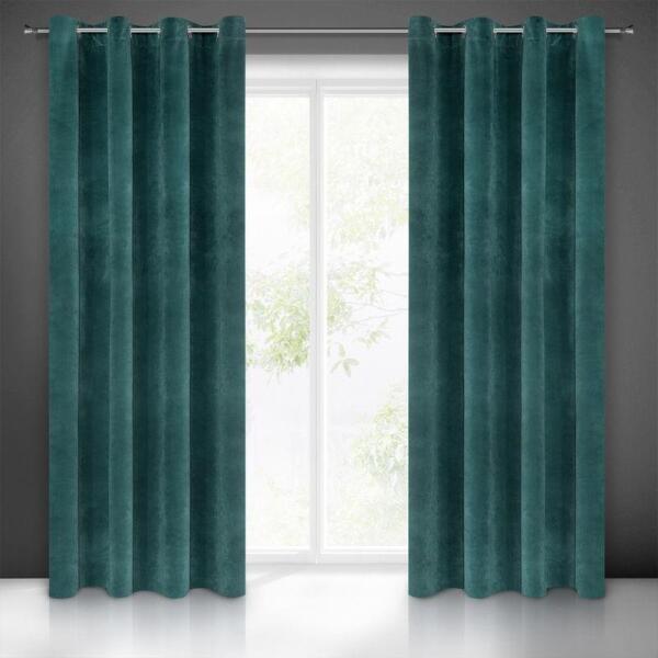 Sima felületű, egyszínű bársony sötétítő függöny, anyaga enyhén fénylik. 10 db nagy ringli biztosítja a könnyű és egyszerű felfüggesztést. Szélesség: 140 cm, hossz: 250 cm, színe: sötét türkiz. Grammsúly: 290 GSM. Összetétel: 100% poliészter