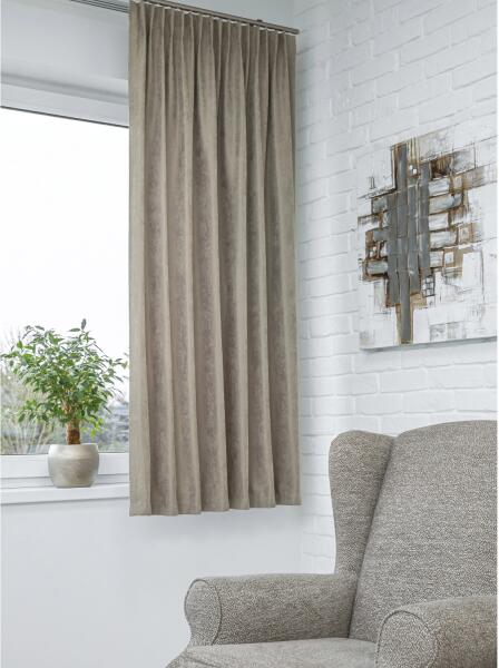 sötétítő drapéria, súly 260g/m2, nem engedi át a napfényt, megakadályozza a zaj behatolását, felvarrt univerzális ráncolószalag, szegélyei beszabva, csipeszre vagy kampóra rögzíthető.