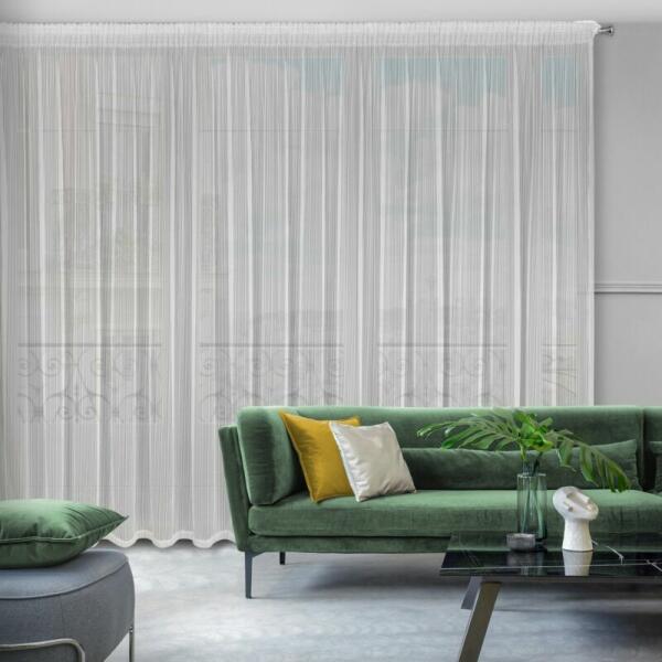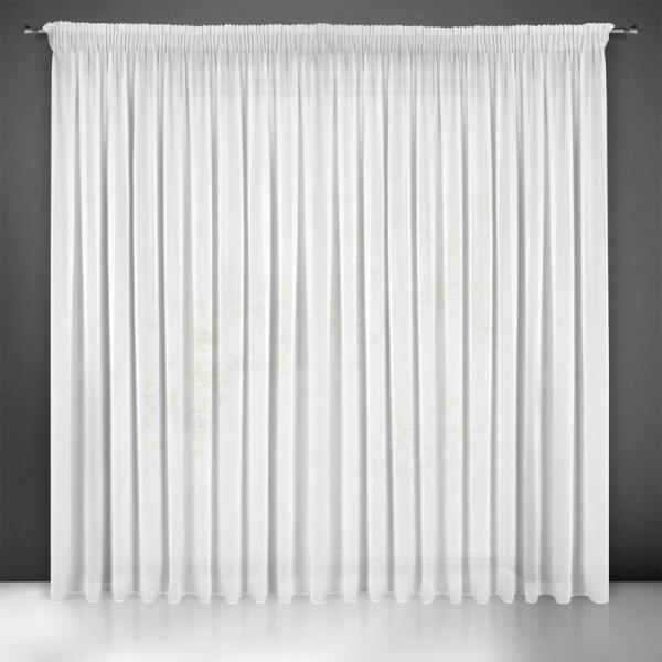 100%polieszter, 130cm magas, 110cm széles, tetején bújtatóval, pálcára fűzhető, modern nyírt mintázatú hófehér voila kész függöny, vasalást nem igényel ,