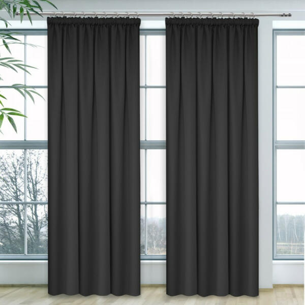 sötétítő drapéria, súly 260g/m2, nem engedi át a napfényt, megakadályozza a zaj behatolását, felvarrt univerzális ráncolószalag, szegélyei beszabva, csipeszre vagy kampóra rögzíthető.