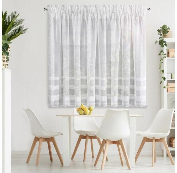 Egyszínű, libbenős etamin függöny, alsó részén vízszintes, mohair szálas csíkok díszítik. Nagyon könnyű és egyszerű darab. Könnyen vasalható. Szélesség: 350 cm, hossz: 150 cm, színe: fehér. Grammsúly: 75 GSM. Összetétel: 100% poliészter