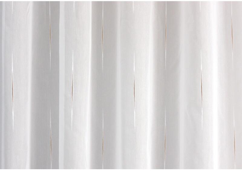 Fehér színű fényáteresztő függöny, modern mintával, melyet bármilyen színű sötétítő függönnyel kombinálhatunk. A függöny aljába varrt ólomzsinór megfelelő esést kölcsönöz a függönynek. Összetétele poliészter.