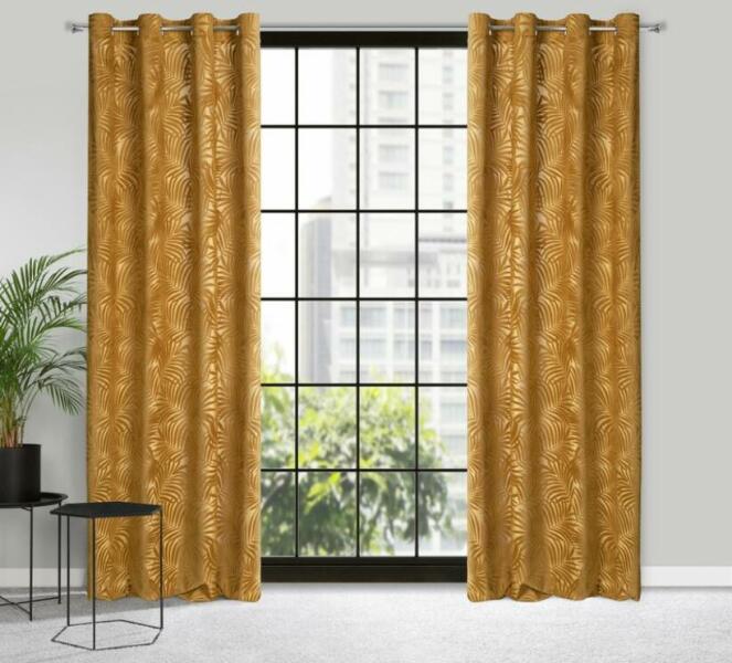 A puha bársonyból készült Livia függöny elegáns, otthonos megjelenését a teljes felületét beborító dombornyomott mintának köszönheti. A vastagabb mintát vékony, átlátszó elemek szövik át, melynek köszönhetően korlátozza a szobába jutó napfényt, de mégis világos, kellemes hangulatot biztosít. A Livia áttört pálmalevél mintás bársony függöny Mézsárga 140x25