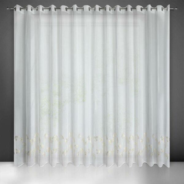 Készfüggöny pezsgő hatású, nyomtatott virágmintával, szélesség: 300 cm, hossz: 250 cm, színe: fehér/arany. Grammsúly: 70 GSM. Összetétel: 100% poliészter
