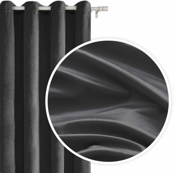 Elegáns VERA sötétítő függöny grafit színben univerzális 250 cm magasságra és 140 cm szélességre, melynek köszönhetően a helységek többségébe megfelelő. Nagyon elegáns hatást kelt. A nappaliját a nyugalom és a pihenés szigetévé varázsolja. Velúr szövetből készült, amely nem engedi át a napsugarakat. Remek választás a nappaliba vagy a hálószobába. PARAMÉTERE