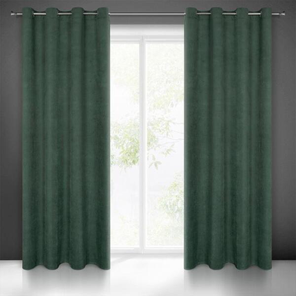 Egyszínű sötétítő függöny apró kocka szerkezetű, puha anyagból. Klasszikus ablakdekoráció, mely könnyen mosható és vasalható. Szélesség: 140 cm, hossz: 250 cm, színe: sötét menta. Grammsúly: 200 GSM. Összetétel: 100% poliészter