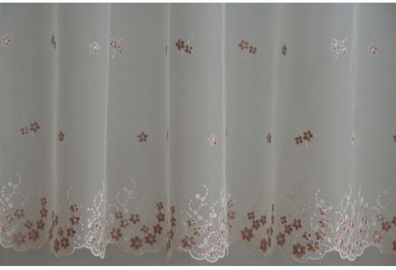 Fehér színű fényáteresztő függöny, melyet elszórtam hímzett rózsaszín virágok diszítenek. Összetétele poliészter. A függönyt az áruházban az Ön által kívánt méretre vágják.