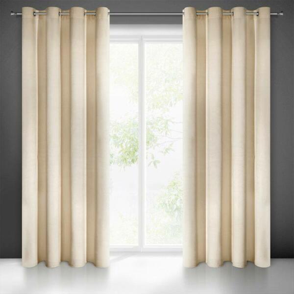 Sima felületű, egyszínű bársony sötétítő függöny, anyaga enyhén fénylik. 10 db nagy ringli biztosítja a könnyű és egyszerű felfüggesztést. Szélesség: 140 cm, hossz: 250 cm, színe: bézs. Grammsúly: 290 GSM. Összetétel: 100% poliészter