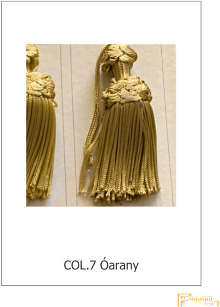 ◤ Kategória: Paszományok ◤ Mérete: 9 cm ◤Zsinór vastagsága: 2 mm ◤ Szín: Óarany ◤ Anyagösszetétel: 90% acetát, 10% polipropilen Kategória: Paszományok Szín: Óarany Anyagösszetétel: 90% acetát, 10% polipropilen Minimum rendelhető mennyiség: 5db A teljes magasság: 9 cm, a csüngő rész magassága: 7 cm a záró kalap magassága: 2 cm, akasztó zsinór hossza: 10 cm. A