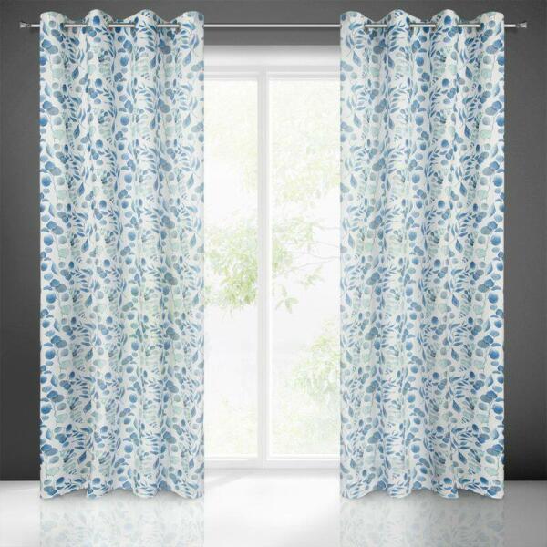 Készfüggöny nyomtatott virágmintával, szélesség: 140 cm, hossz: 250 cm, színe: fehér/kék. Grammsúly: 75 GSM. Összetétel: 100% poliészter