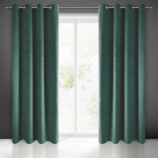 Készre varrott bársony sötétítő függöny. Egyszínű anyaga puha tapintású és jellegzetes bársonyos fénnyel gyönyörködteti a szemet. A vaskos szövet magas fokú árnyékolást tesz lehetővé. Szélesség: 140 cm, hossz: 250 cm, színe: sötét türkiz. Grammsúly: 215 GSM. Összetétel: 100% poliészter
