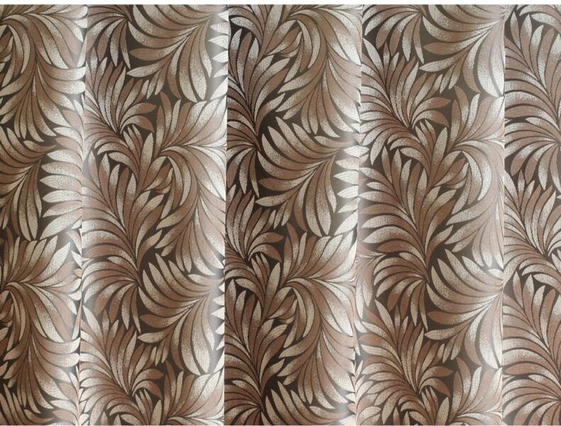 Barna levélmintás dekor anyag. 285 cm magas méteráru, melynek összetétele poliészter. A dekoranyagot az áruházban az Ön által kívánt méretre vágják.