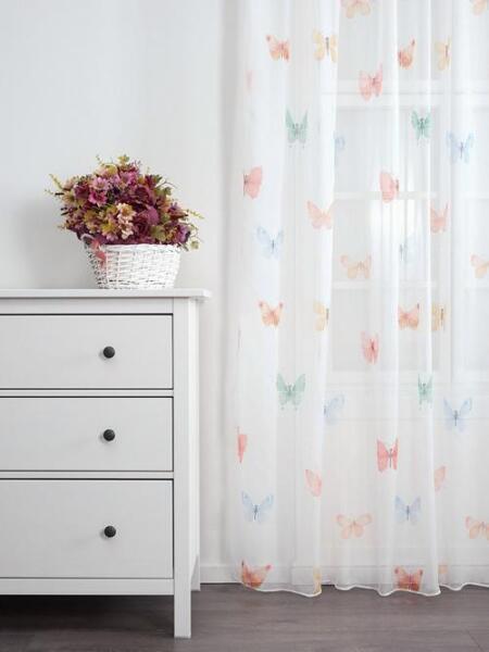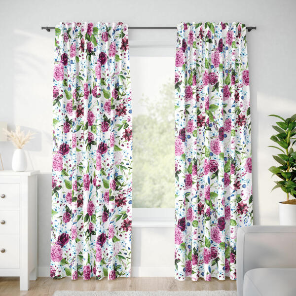 dekoratív szövet Rongo, 100 % poliészter, sima, nem gyűrődő, színstabil szövet, felvarrt univerzális ráncolószalag, szegélye beszabva, csipeszre vagy kampóra rögzíthető.