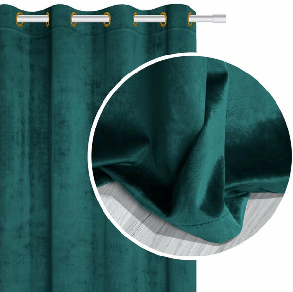 A VELVET bársonyos velúr dísz sötétítő függöny 250x140 cm méretben és smaragdzöld színben készül, így szinte minden helységbe megfelelő. A velúr anyagának köszönhetően nagyon elegáns és luxus hatást kelt. A velúr anyag félig matt, igen könnyű, puha, bársonyos és kellemes tapintású. Az akasztórúdra könnyen rátehető a 4 cm átmérőjű ezüst színű karikák s