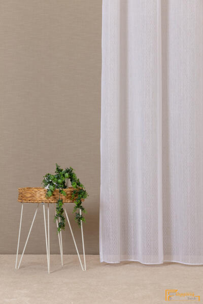 100%polieszter, 180cm magas, 400cm széles, tetején ráncolóval, amivel a kívánt méretre húzható, alján ólommal, modern nyírt mintázatú hófehér voila kész függöny, vasalást nem igényel ,