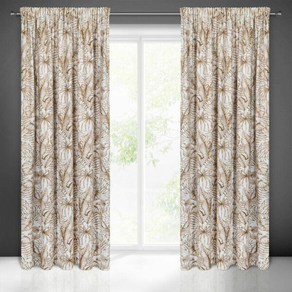 kész dekoratív drapéria LONETA, Spanyol szövetből varrva, súly 190g/m2, felvarrott univerzális ráncolószalag, szegélye beszabva, csipeszre vagy kampóra rögzíthető.