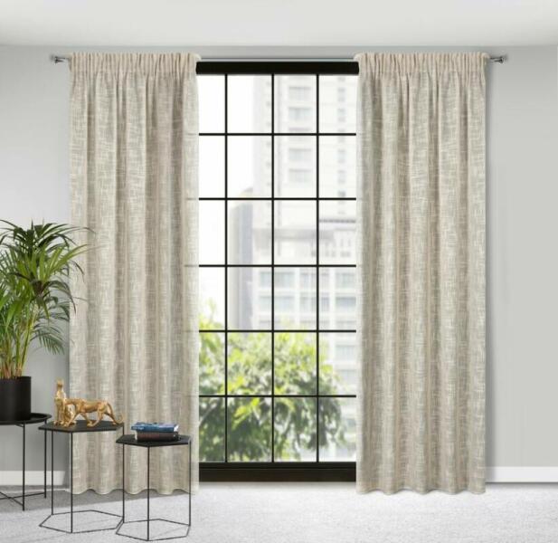 pamut drapéria, felvarrt univerzális ráncolószalag, szegélye beszabva, 100 % pamutszövet, súly 145g/m2, csipeszre vagy kampóra rögzíthető.