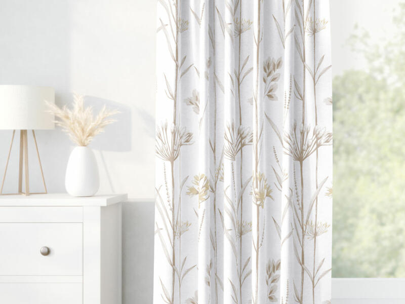 kész dekoratív drapéria, 100 % poliészter, súly 160g/m2, felvarrt univerzális ráncolószalag, szegélye beszabva, csipeszre vagy kampóra rögzíthető.