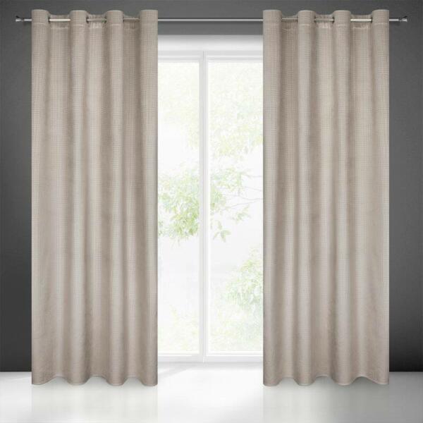 Készre varrott bársony sötétítő függöny pepita mintával, szélesség: 140 cm, hossz: 250 cm, színe: bézs. Grammsúly: 210 GSM. Összetétel: 100% poliészter