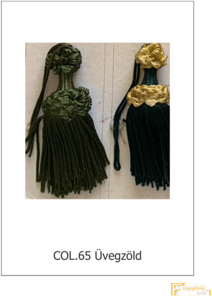 ◤ Kategória: Paszományok ◤ Mérete: 9 cm ◤Zsinór vastagsága: 2 mm ◤ Szín: Üvegzöld ◤ Anyagösszetétel: 90% acetát, 10% polipropilen Kategória: Paszományok Szín: Üvegzöld Anyagösszetétel: 90% acetát, 10% polipropilen Minimum rendelhető mennyiség: 5db A teljes magasság: 9 cm, a csüngő rész magassága: 7 cm a záró kalap magassága: 2 cm, akasztó zsinór hossza: 10