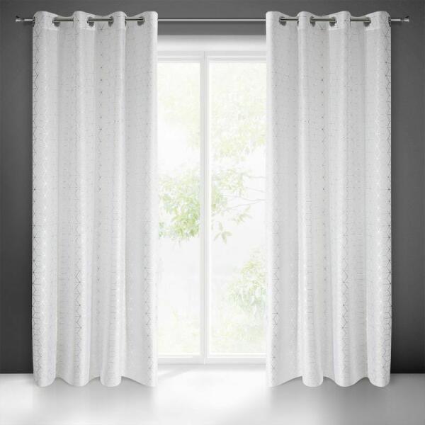 Könnyű függöny minimalista stílusban. Fehér anyagát ezüst geometrikus minta díszíti. sötétítő függöny szerepében is megállja a helyét. Szélesség: 140 cm, hossz: 250 cm, színe: fehér/ezüst. Grammsúly: 50 GSM. Összetétel: 100% poliészter