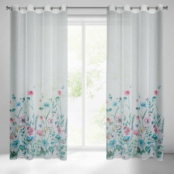 100%polieszter, 140cm széles, 150cm magas, tetején ráncolóval, mellyel a kívánt méretre behúzható, lágy esésű finom tapintású, könnyen kezelhető anyag, vasalást nem igényel, közepesen sötétít, erős napsütés elzárására nem alkalmas, inkább dekorációnak, árnyékolásra,