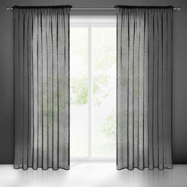 Fekete függöny Ez a fekete függöny egy készfüggöny háló szerkezetű anyagból. Méret: szélesség: 140 cm, hossz: 250 cm, színe: egyszínű fekete. Grammsúly: 140 GSM. Összetétel: 100% poliészter anyag. Bár fényáteresztő függönyről van szó, de remek kiegészítő a sötétítő függöny mellett, ha szórt fényre vágysz a szobában. Bármilyen sötétítő függöny mellé