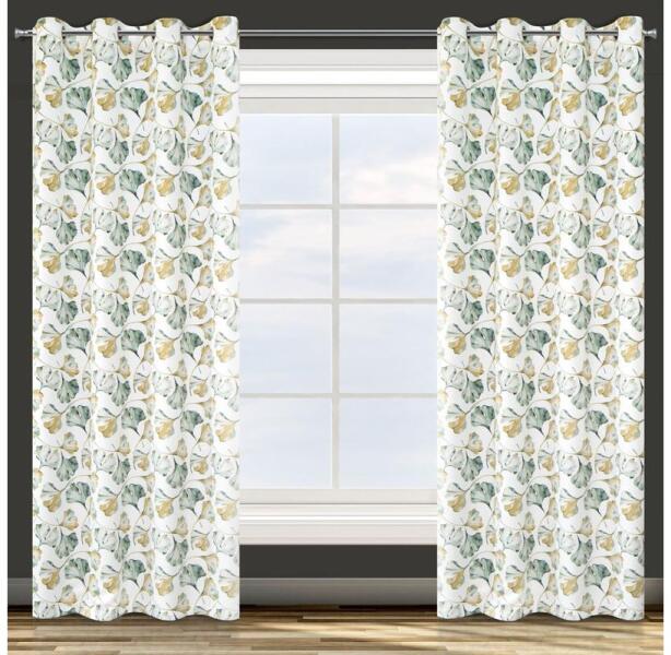Divatos függöny ginko biloba levél mintával. A vastagabbnak mondható, lágy, szatén sötétítő anyagból készül, mely optimális védelmet nyújt a belső térnek a napsugaraktól. Modern és klasszikus tereket is egyaránt díszíthetünk vele. Kiváló minőség és esztétikusság jellemzi. A függönynek csak az egyik oldala mintás, a másik fehér színű.