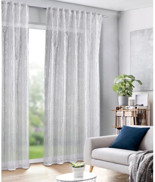 Neusser kiváló minőségű készfüggöny. Modern, grafikus dizájn. A praktikus rejtett hurkok által bármilyen fajta rúdkarnisra akasztható. Behúzó szalaggal is ellátott. 30 fokon mosható kímélő programban.