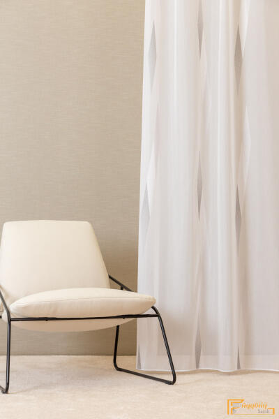 dekoratív szövet Rongo, 100 % poliészter, sima, nem gyűrődő, színstabil szövet, felvarrt univerzális ráncolószalag, szegélye beszabva, csipeszre vagy kampóra rögzíthető.
