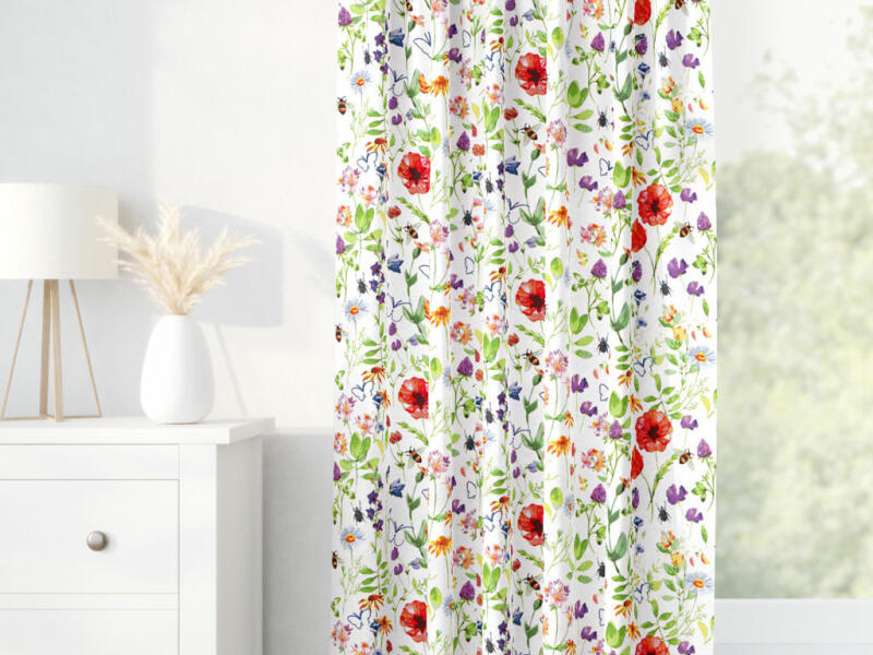 pamut drapéria, felvarrt univerzális ráncolószalag, szegélye beszabva, 100 % pamutszövet, súly 145g/m2, csipeszre vagy kampóra rögzíthető.