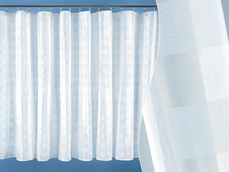 kész dekoratív drapéria, 100 % poliészter, súly 160g/m2, felvarrt univerzális ráncolószalag, szegélye beszabva, csipeszre vagy kampóra rögzíthető.