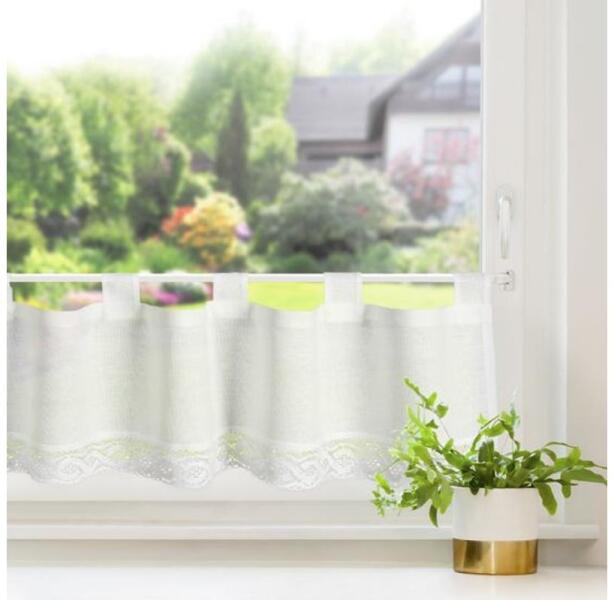 Vitrázs függöny 30 magas, kiváló minőségben! 60% pamut 40% poliészter anyag felhasználásával készült kész függöny. Csipke sorral díszített. Könnyen vasalható és praktikusan rúdra felhúzható a felső részébe vart bújtatónak köszönhetően. A fényáteresztő függönyök és azon belül a vitrázs függönyök között további sok, csodálatos konyhai függönyt talál