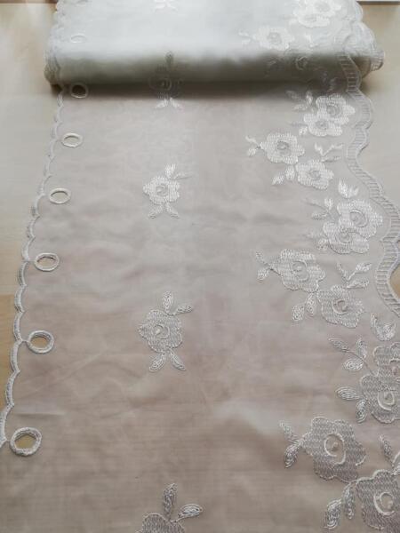 100%polieszter, 180cm magas, 210cm széles, tetején ráncolóval, alján ólommal, modern hímzett mintázatú ecrü színű voila kész függöny,