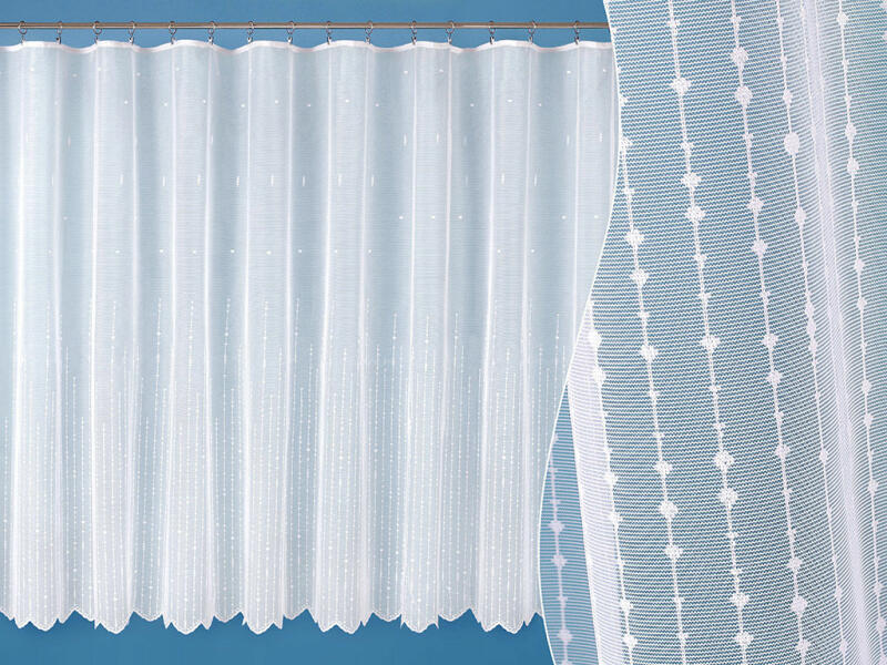Fényáteresztő függöny fehér színű, mely egyszerű mintájával minden stílushoz illeszthető. Összetétele poliészter. A függönyt az áruházban az Ön által kívánt méretre vágják.
