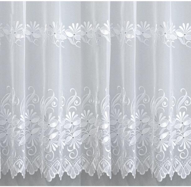 Fehér hímzett fényáteresztő függöny, 175 cm magas, összetétele 100 % poiészter.