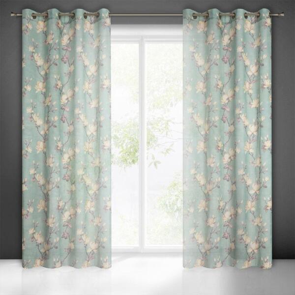 Klasszikus függöny lenvászon textúrájú anyagból, pasztell színű virágminta díszíti. Közepes fokú árnyékolást biztosít. Könnyen vasalható szövet. Szélesség: 140 cm, hossz: 250 cm, színe: menta/rózsaszín. Grammsúly: 130 GSM. Összetétel: 100% poliészter
