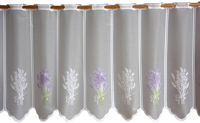 Fehér színű, levendulamintás, bordűrös jacquard függöny, amely szín- és mintavilágával természetközeli és kellemes hangulatot varázsol az otthonába. Az egyszerűségének köszönhetően bármilyen színű sötétítőfüggönnyel jól mutat. A legmodernebb technológiát alkalmazva, környezetbarát anyagok felhasználásával és raschel kötési technikával készült a termék