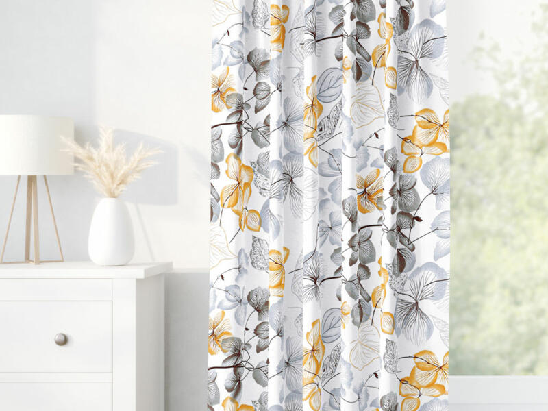 Telemintás, nyomott, színes voile (voál), stilizált, indaszeűen felfelé kúszó virág- és levélmotívumokkal. A függönyt az áruházban az Ön által kívánt méretre vágják.