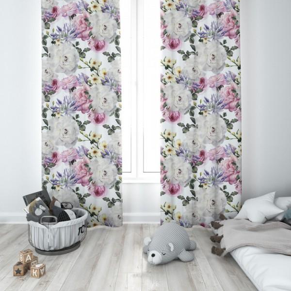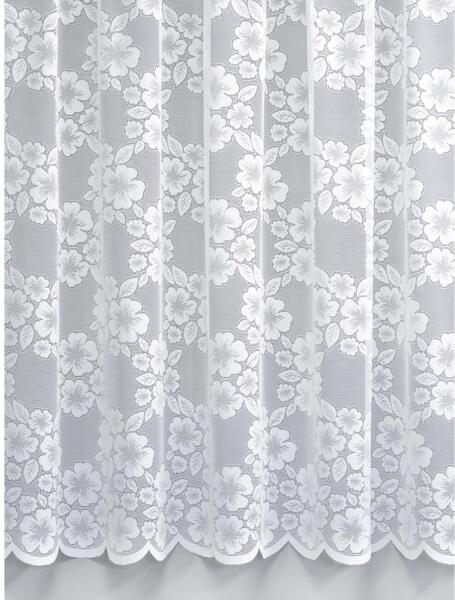 Fehér virágos mintás jacquard fényáteresztő függöny, 280 cm magas, összetétele 100 % poliészter.