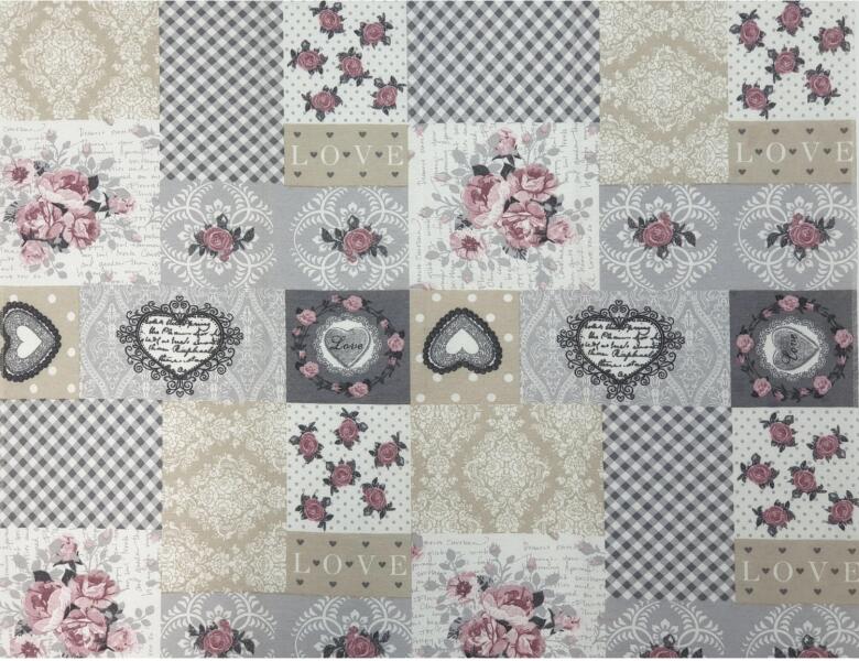 Romantikus rózsa mintával nyomott dekoranyag, terítőnek, párnának, dekorfüggönynek. Szélessége 140cm. Környezetbarát anyagok felhasználásával készítették pamutból és poliészterből. A dekoranyagot az áruházban az Ön által kívánt méretre vágják.