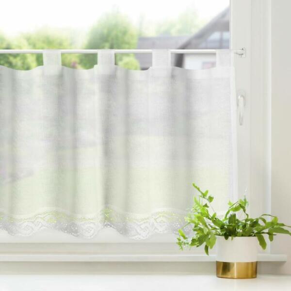 Kiváló minőségű, 60% pamut 40% poliészter felhasználásával készült szövetből készült vitrázs függöny. Csipke sorral díszített. Könnyen vasalható és praktikusan rúdra felhúzható a felső részébe vart bújtatónak köszönhetően.