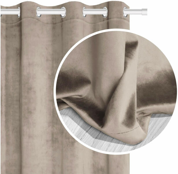 Bézs színű bársonyos velúr dísz sötétítő függöny 250x140 cm méretben, amely így szinte minden otthonba megfelelő választás. A velúr anyagának köszönhetően nagyon elegáns és luxusos hatást kelt, tökéletes minden nappaliba vagy hálószobába. A velúr anyag félig matt, igen könnyű, puha, bársonyos és kellemes tapintású. Az akasztórúdra könnyen rátehető a 4 cm