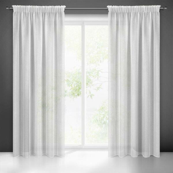 kész dekoratív drapéria, 100 % poliészter, súly 160g/m2, felvarrt univerzális ráncolószalag, szegélye beszabva, csipeszre vagy kampóra rögzíthető.