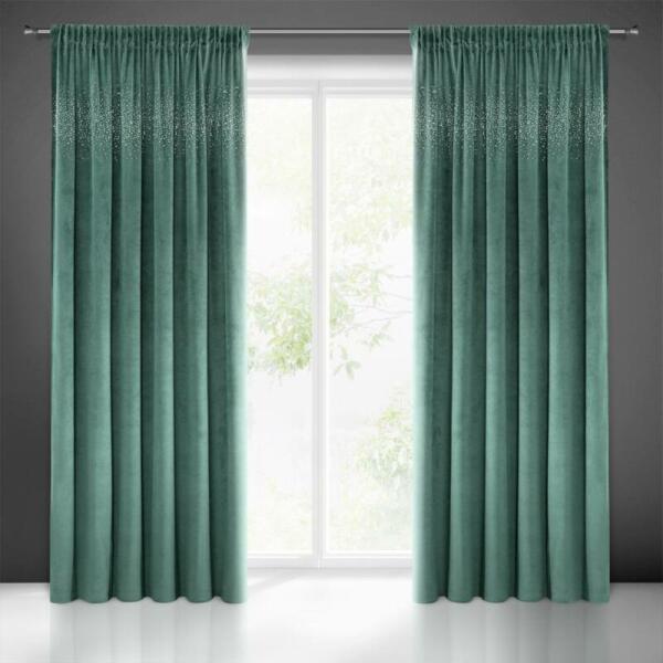 Bársony sötétítő függöny ezüst nyomtatott mintával, szélesség: 140 cm, hossz: 250 cm, színe: ezüst/türkiz. Grammsúly: 200 GSM. Összetétel: 100% poliészter