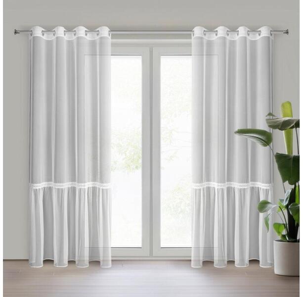 100%polieszter, 180cm magas, 300cm széles, tetején ráncolóval, alján ólommal, modern nyírt mintázatú hófehér voila kész függöny,